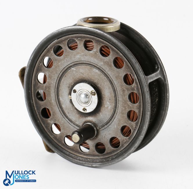 Hardy Bros "The St George" alloy trout fly reel 3 ¾" spool stamped D W X V internally, with 3 screw latch, black handle, milled rim tensioner, good constant check, clear agate lined reel guide, usual wear for age. Runs well, play to spool