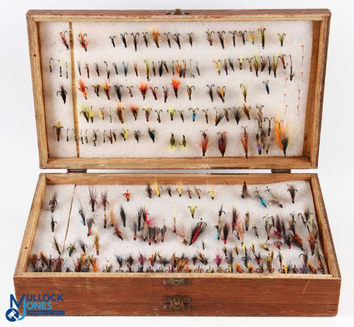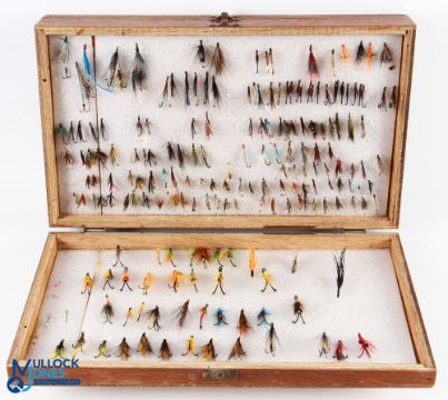A large collection of sea trout and low water salmon double and single flies in 4-sided hinged wood box 15" x 9" x 3". All four sides lined with foam, containing over 400 flies. All look good