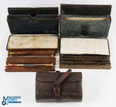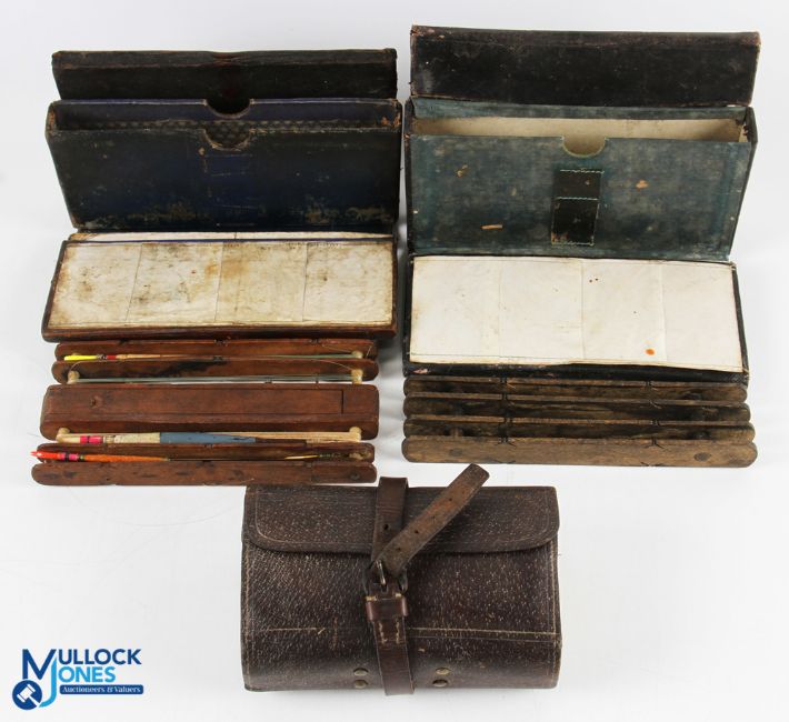 Unnamed leather Fisherman's Compendium with mahogany line winder with sliding lid, cap and shot with 3 quill rigs, 6 vellum pockets with rigs, missing strap. Unnamed leather Fisherman's Compendium with mahogany winder, 8 pockets, missing strap. Hardy Alnwick leather cast and hook wallet with 2xleather pockets and 20 various use leaves, with original strap and buckle (3)