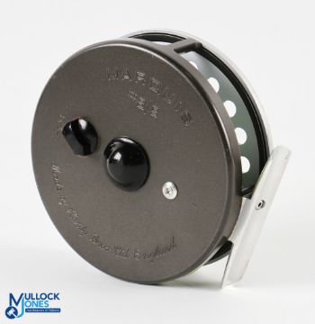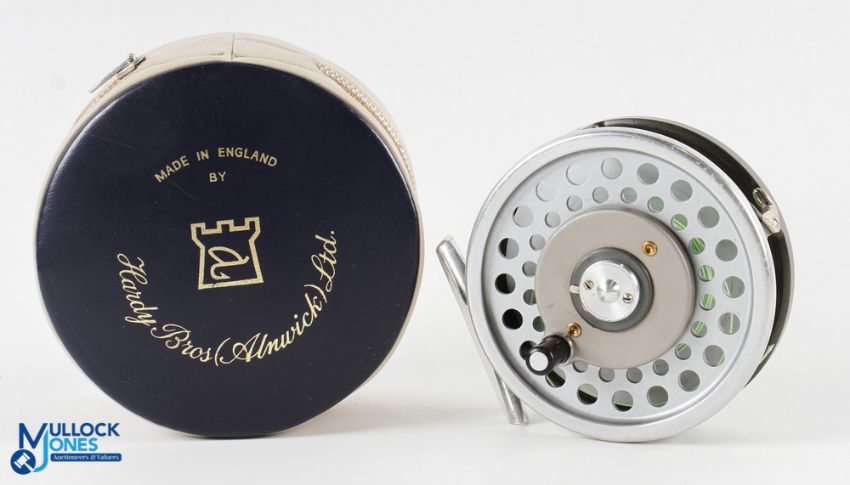 Hardy Bros "Marquis 8/9" alloy multiplier trout fly reel 3 5/8" spool, 2 screw latch, black handle, U shaped alloy line guide, rear tensioner, constant check, MZC. Very light use, runs well