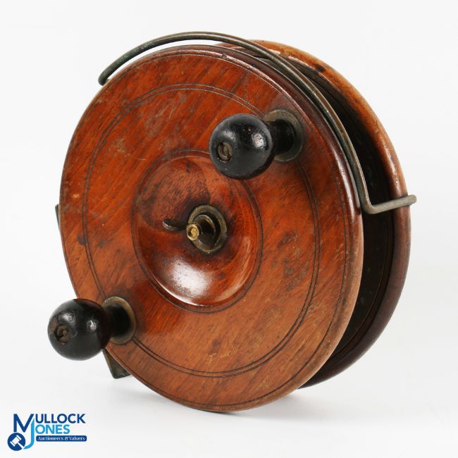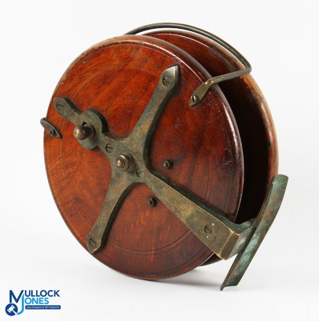 Sun Star Back brass and mahogany reel 6.5", brass flange, back spool with wing nut central tensioner and twin bulbous bass mounted handles, on/off check, brass Bickerdyke style line guide, foot bent one end. Runs well