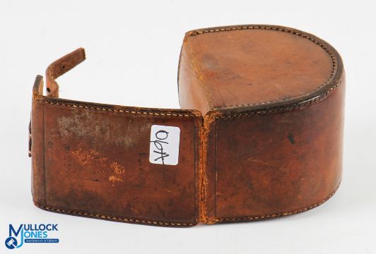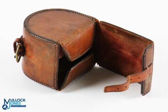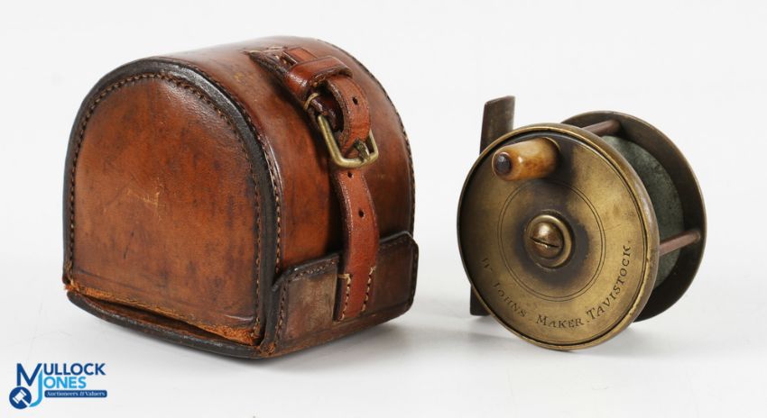 Scarce W Johns Maker Tavisock brass trout fly reel, 2 ¼" spool with polished horn handle, constant check, 3 pillar frame with correct bridge foot. In block leather D case with wine lining, replaced strap and buckle