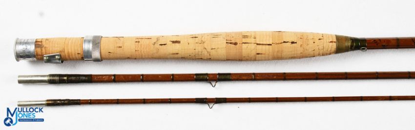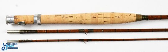 Hardy Bros The Fairchild Palakona 9ft 3 piece split cane fly rod E14454 with spare tip, alloy sliding reel fitting, cork handle, brass collar, agate butt tip ring, refurbished, in maker's alloy tube, screw top and shield logo - MCB
