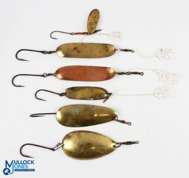 Interesting collection of large spoons, made up of: Kennell Stewart USA No 7 brass/silver 5" spoon. Kennell Stewart USA No 7 copper/silver 5" spoon. Kennell Stewart brass/silver spoon. Pfleuger 5" spoon. Small Hendryx No 6 (rare) spoon. Hendryx 4 ½" spoon (6)