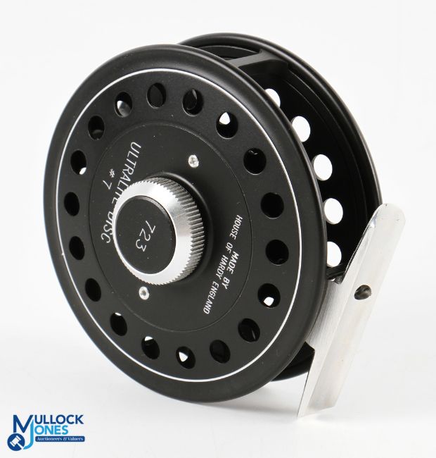 Hardy Bros "The Ultralite Disc" alloy trout fly reel, black spool, limited edition No 723, 2 screw latch, black handle, large rear tensioner (good check), looks unused. In MZC with instructions and original card box with correct labels. Very good