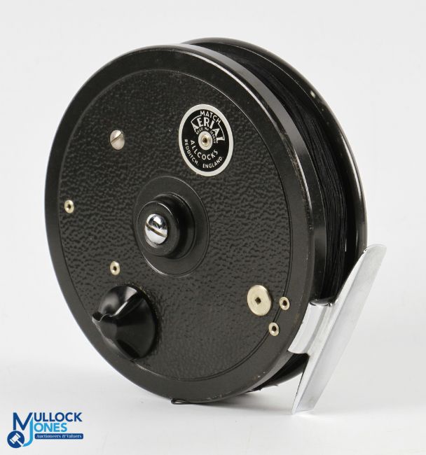 Allcocks Redditch match aerial centre pin/trotting reel 4 ½" caged narrow spool, 6 spokes with tensioner and spool release, on/off check, alloy foot. Runs very well, very light use, in zip case