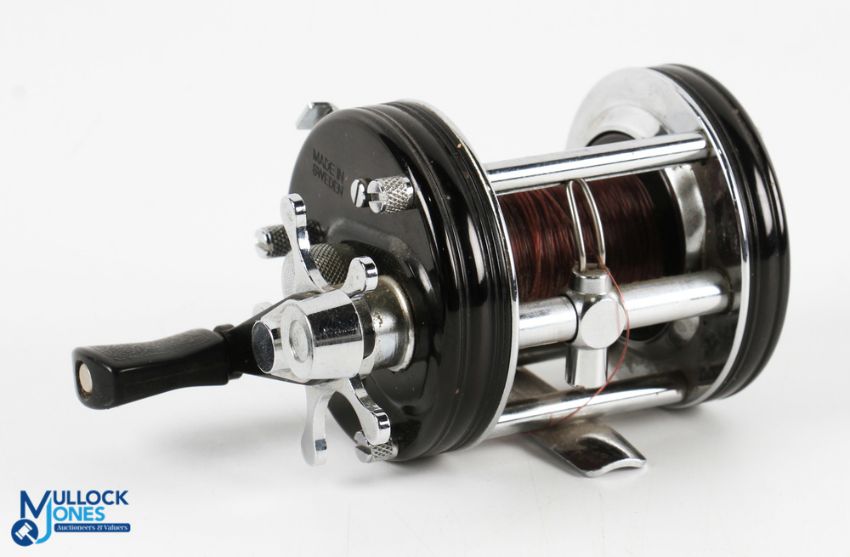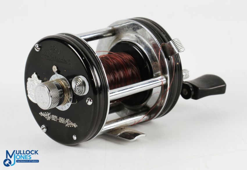 A special Abu 70th Anniversary edition of the Ambassadeur 6000C multiplier, details stamped to side, counter balanced handle, side tensioner, on/off check, seat No 03705. In original leather case with spanner, parts, instructions and card box with certificate. Runs very well