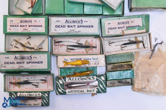 A Collection of Boxed Allcocks Baits, to include dead bait spinners, true form bait, natural bait spinners 5 boxes in a trade box, golden sprat, invisible shrimp (17)