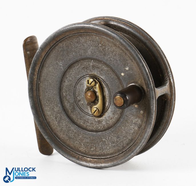 Hardy Bros "The Uniqua" alloy duplicated MkII trout fly reel, 3 1/8" spool with telephone latch, black handle, ribbed full brass foot (missing one screw), runs well