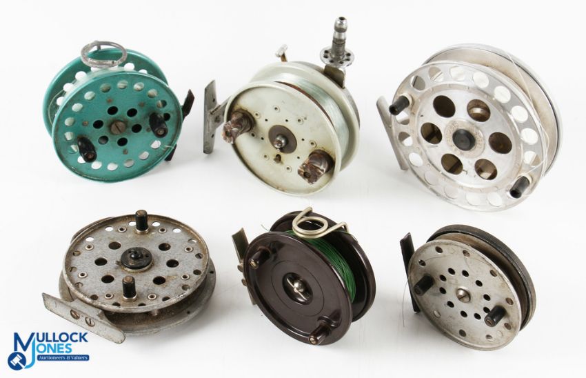 W & S Products, Leeds 5 ½" alloy trotting reel with spring on/off brake dial to backplate. A Gypsy D'Or 4.5" trotting reel, lacking 2 hub screws. A Grice & Young Orlando casting reel with removable spool, ratchet and brake, a 3 ¾" alloy trotting reel, black crackle backplate, check button, spins well, an Allcock Aerialite trotting reel with line guide, repair to foot plus one other. (6)