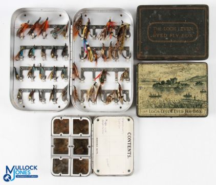 A collection of fly tins made up as follows: Richard Wheatley slim alloy 6" x 3 ½" with 40 medium clips and quantity single, double and treble sea trout and salmon hooks. Good catch. Richard Wheatley top pocket fly tin 3 ½" x 2 ½", 6-sections with washable aide memoire in lid, good quantity dry flies, good catch. Loch Leven eyed fly box, 35 medium clips and 50 small, quantity of flies, closes well. Loch Leven eyed fly box, not eyed but cork (4)