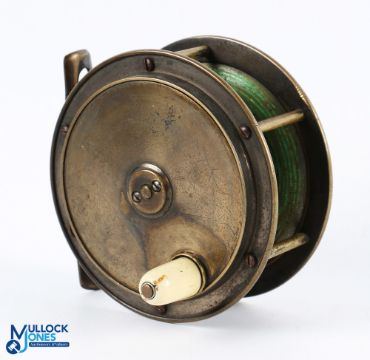 Hardy Bros all brass Hercules fly reel 4" spool with cream handle, 6 pillar frame with full ported foot, looks original retaining a good finish, runs well