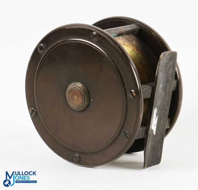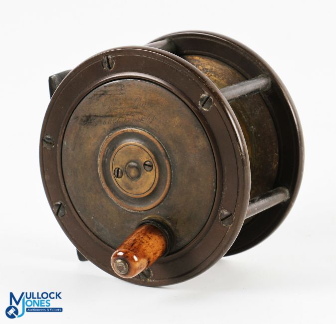 Victorian John Shaw Maker, Salop, 3.5" brass ebonite reel, maker's mark to face place with Victorian diamond reg mark, original handle (loose) brass foot, constant check, looks original