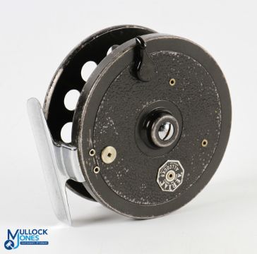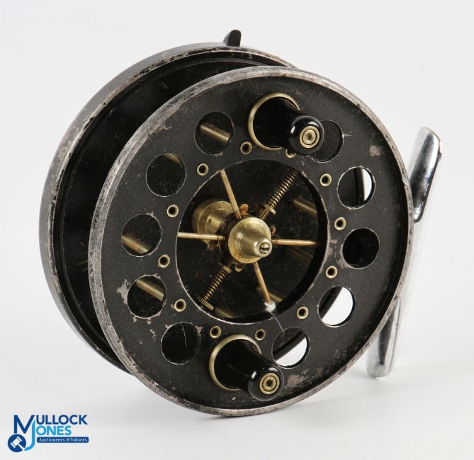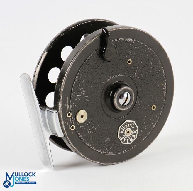 Allcocks Redditch "The Aerial" centre pin trotting alloy reel 3 5/8" caged 6 spoke spool, spoke tensioner and spool catch, twin black handles, on/off check. Signs of use, runs very well