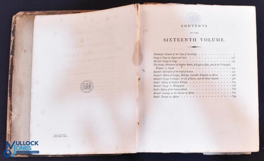 Thunberg's Account of the Cape of Good Hope 1770s (1814) - Volume 16 of "A General Collection of Voyages and Travels in all parts of the World" by John Pinkerton, London 1814. 147pp large 4to with an engraved view of Table Mountain (library stamp). The volume comprises 917pp with accounts of other travels, almost all in Africa. Ex Lib. Needs a new binding otherwise in very good condition