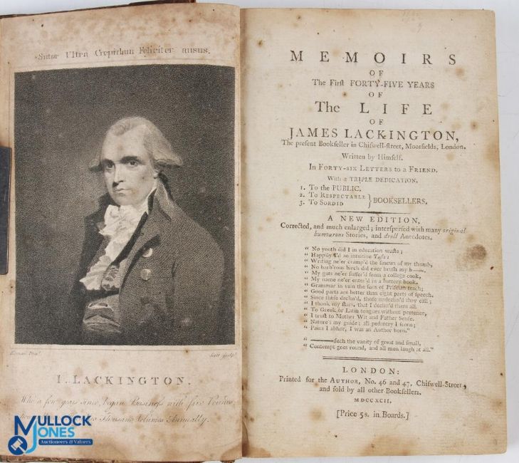 Memoirs of The First Forty-Five Years of The Life of James Lackington - The Present Bookseller in Chiswell Street, Moorfields, London 1792. An extensive 484 page book detailing his life wide ranging interests and work. In old marble board binding with ribbed leather spine, size 5.25" x 8.25"