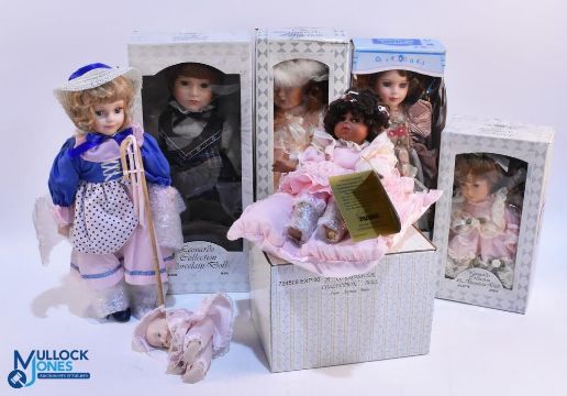 Porcelain Doll Collection, to include - a Seymour Mann collector doll, 2x H Samuel Christmas 2000 dolls, Leonardo collection 8" Juliet, 16" Nicky, Olvia, Stephanie, and others most boxed G (10 figures in 2 boxes)