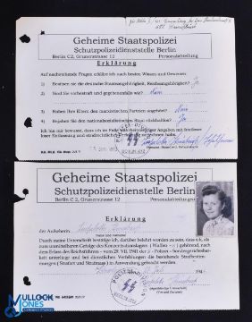 Third Reich - Gestapo printed form with ms insertions being a questionnaire issued to a female member of the K2 Guards - and therefore a member of the Waffen SS investigating various aspects of her behaviour but stating that only the laws of the SS will be used in case of 'crimes'. Rare.