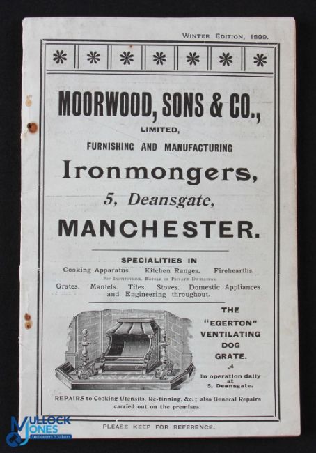 Moorwood Sons, 5 Deansgate, Manchester 1899. An extensive 112 page catalogue illustrating hundreds of items plus many not associates with ironmongers, ie sports goods, silver ware, telephones, all with details and prices- In illustrated card cover, size 5.5" x 8.25"