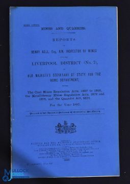 Liverpool District - Mines & Quarries Report 1897. Home Office Report - includes details of 86 fatalities giving date, colliery, name of owner or company, persons names, ages, occupations and causes of death. Details of the disaster at Tawd Vale Colliery, Skelmersdale, on the 30th November when the river bed collapsed and flooded the mine. 45pp folio with a sketch of Tawd Vale and 4 views taken from photographs. Stitched blue printed wrap. Very good condition