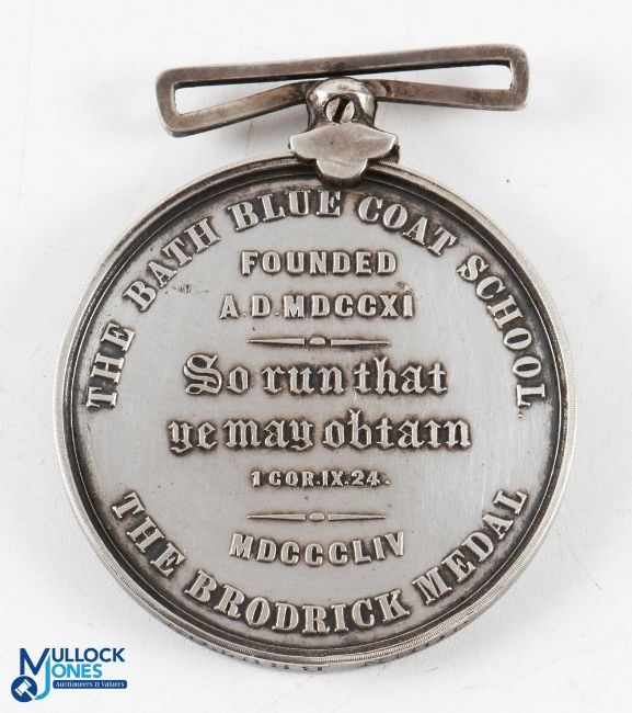 Bath - Blue Coats School Medal 1856. "The Brodrick Medal awarded to John Bruton, medal dia. 44mm (The school was founded in 1711 for 50 boys and 50 girls by Robert Nelson (1656-1715), a local Low Church Anglican, with assistance from Richard Skrine (1691-1737) of Warleigh Manor. On leaving each pupil was gifted £6, or £5 for girls, towards an apprenticeship. It closed in 1920)