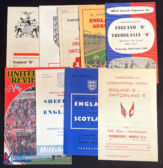 Selection of England 'B' home match programmes Switzerland (1st 'B' match at home), 1955 Germany (Duncan Edwards), 1955 Yugoslavia (with team insert), 1956 Switzerland (Duncan Edwards), 1957 Scotland, 1957 v Sheffield ('B' match celebrating centenary celebration for the Sheffield club), 1980 USA (at Man. Utd.), 1979 New Zealand, 1980 Spain; fair/good. (9)