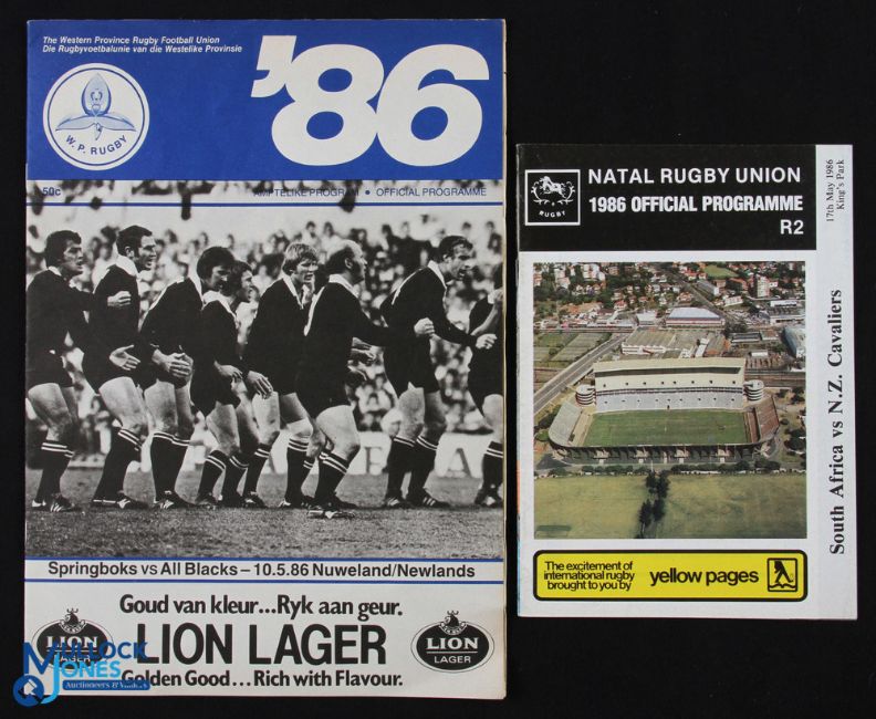 1986 New Zealand Cavaliers in S Africa Test Rugby Programmes (2): First and second test programmes from Cape Town and Durban. VG