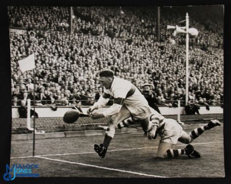 1958 RL Challenge Cup Dramatic Photograph: Wigan beating Workington 13-9 in the Challenge Cup Final at Wembley, and the turning point here when Cherrington of Wigan's goal-line corner flag tackle makes Southward of Workington drop the ball over the line! Terrific sharp 10" x 8" action shot, great memories