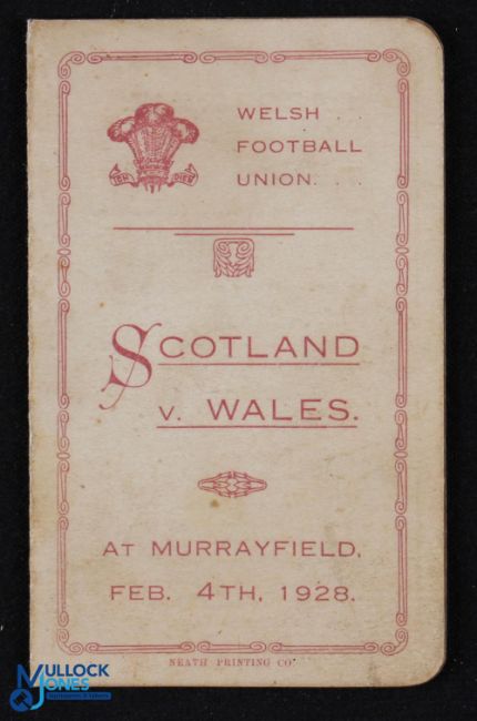 1928 Wales Rugby Itinerary to Scotland: Lovely little fold-over buff and red fold-over official players/committee card, a little foxed to rear, full details of trains, hotels, meals etc, very evocative item. G otherwise