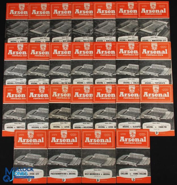 1956/57 Arsenal home programme collection full league season, FAC Stoke City, Preston NE, WBA plus England v Young England exhibition match programme; fair/good. (A Lot)