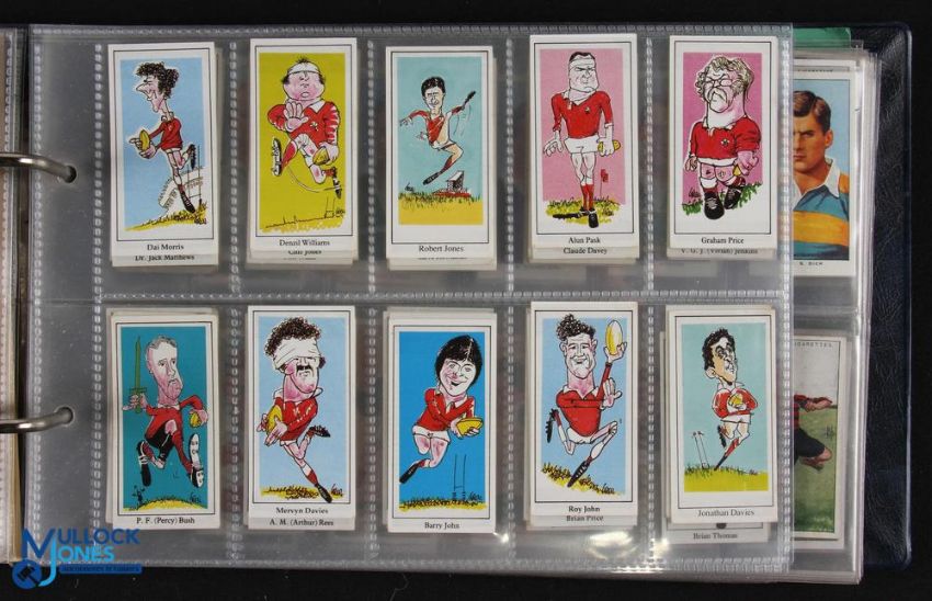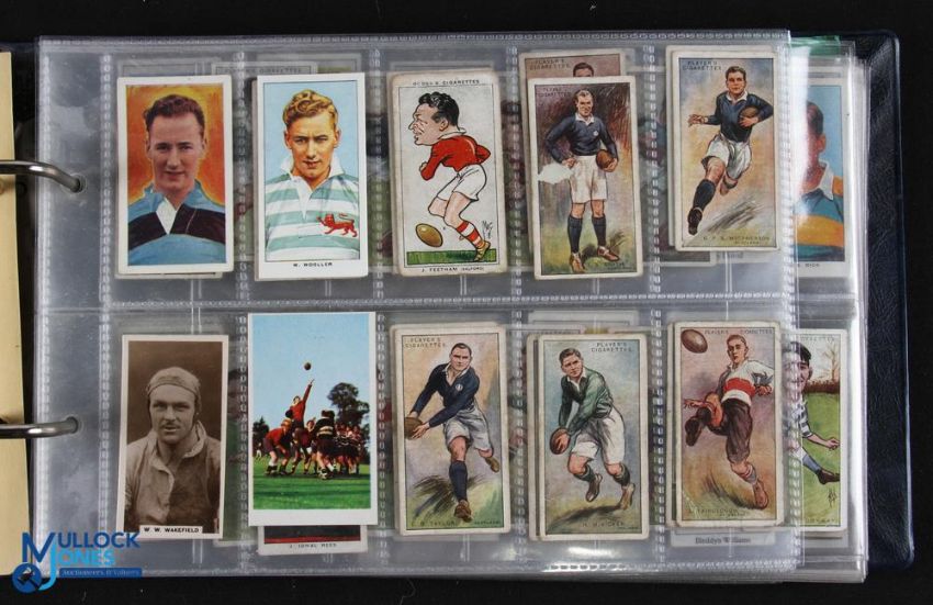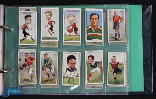 Rugby Cigarette Card Collection (229): Neatly sleeved and ordered in leatherette album, some 230 mostly vintage cards with caricatures, portraits, drawings or action poses of rugby stars from the '20s on, plus a reprint 1905 All Blacks set. Many in colour, with sets or part sets from the great names of the genre: Players, Ogdens, Wills, Churchman, Ardath etc as well as the South Wales Echo & the Daily Telegraph. A marvellous kick-start to a collection or a fine 'fill-your-gaps' opportunity. Mostly VG
