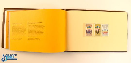 1976 Canadian Olympic Stamps Souvenir Collection with leather cover containing history of the Olympic Games and seven pages of stamps - 22 in total