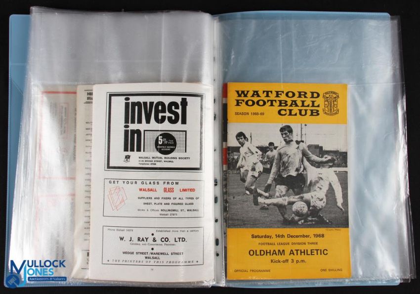 Complete collection of 1968/69 Oldham Athletic away programmes Div. 3 league (23) plus Bury (friendly, single sheet), FAC Wrexham and FLC v Preston NE; fair/good. (A Lot)