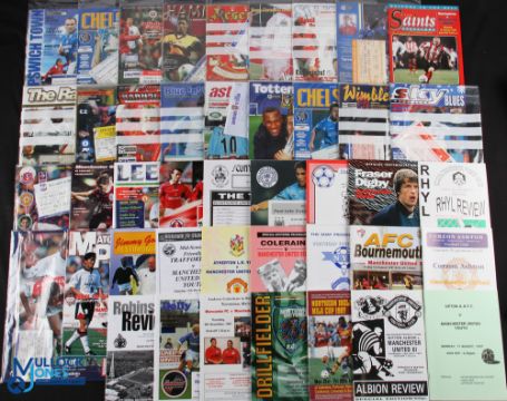 1997/98 Manchester Utd complete season away league programmes (19) + tickets (16); FAC away Barnsley + ticket, Chelsea + ticket; Coca Cola Cup at Ipswich Town + ticket; away match friendlies Urawa Red Diamond, South China, Manchester City (Lake testimonial + 4 page insert), Gresley Rovers, Swindon Town, Rhyl, Northern Ireland, Milk Cup (junior tourney), Witton Albion, Upton FC, Lancaster City, Morecambe, Northwich Victoria, Altrincham, Bournemouth, Curzon Ashton, Northern Youth (U19's), Colraine, Atherton LR (youth), Trafford (youth), Goodfellow benefit (at Cardiff), Scunthorpe Utd; good. (A Lot)