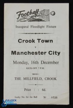 Scarce friendly match programme 1968 Crook Town v Manchester City inaugural floodlit fixture at Millfield ground 16 December 1968, 4 page b&w issue; fair/good. (1)