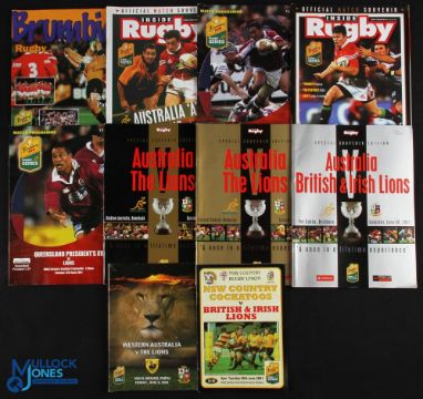 2001 British & I Lions Rugby Programmes (10): Super full set from the exciting 2001 tour, with the scarcer Western Australia game included of course, and with the fine large First Test issue boldly signed by 18 Lions to their team page. Excellent