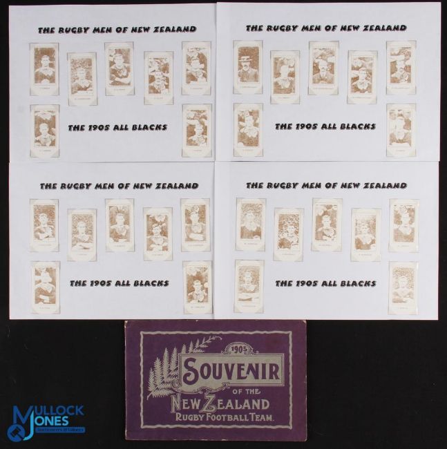 1905/1981 NZ Rugby Souvenir & Cigarette Card Set (2): The sought-after 1981 reprint of the rare original 1905 28pp landscape style pictorial booklet previewing the 'Originals', the All Blacks touring to Europe and the USA 118 years ago. Lovely reproduction of the packed issue for the Wellington v NZ final internal tour match before setting sail. Plus the more recent Orbit Advertising set of 28 cards of the NZ players, taken individually from one of the 1905 postcards of the squad, mounted with caption to four white A4 sheets. All VG