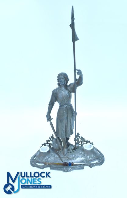 Rare Spelter French Desk Inkwell of a detailed Joan of Arc with original ceramic ink pots comes with a glass and 800 silver pen 55 x 30cm