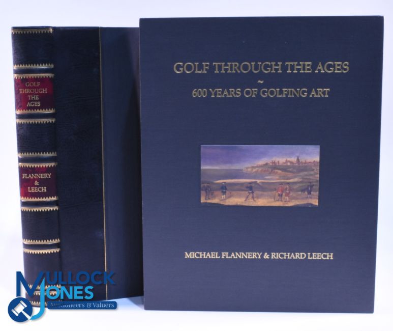 Flannery, Michael & Richard Leech, - Signed - "Golf Through the Ages: Six Hundred Years of Golfing Art" 1st ed 2004 - The Large Paper Royal Edition - in quarter blue and gilt calf leather boards with ribbed and gilt spine. Illustrated with beautiful colour photographs - ltd ed no. 121/1999) - signed by both authors to the limitation page. An exquisite book on the game of golf, spanning six centuries of history and representing thirteen years of scholarly research on four continents. It is lavishly bound, and a stunning collection of golfing art c/w authors bound publicity booklet and colour advertising leaflets. In the original matching protective linen and gilt slip case - quite stunning. Note: From The Estate of The Late David Easby