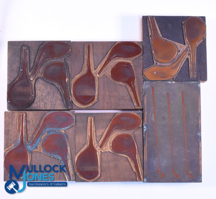 Interesting Collection of Scottish Clubmakers Woods Advertising Copper Printing Block Plates (6) mostly D Anderson & Sons St Andrews to incl 5x blocks displaying different Drivers, one with horn sole insert, 3x with sole plates all stamped Driver, models incl Blackhawk, Elite, Elect et al (approx. 4" x 4") and another block displaying a set of woods probably a driver, brassie and spoon approx. 6" x 3.5" - Note: From The Estate of The Late David Easby