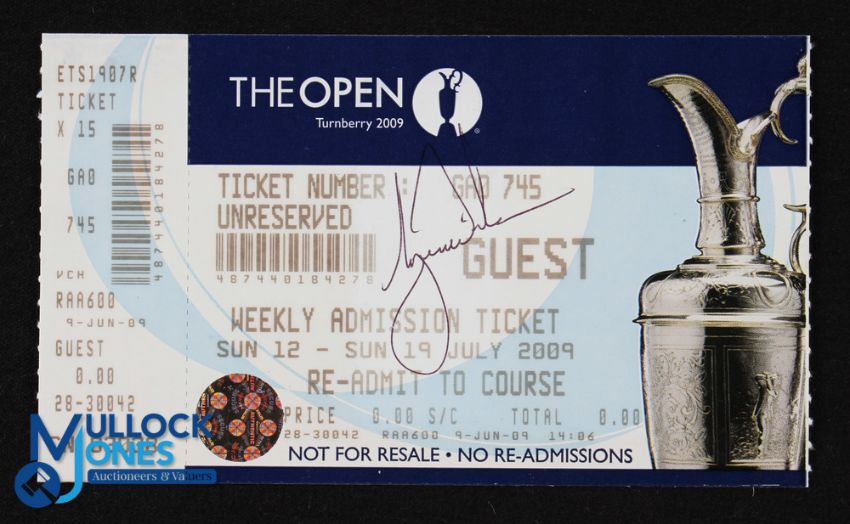 Rare Tiger Woods 2009 Turnberry Open Golf Championship Signed Guest Weekly Entrance Ticket - acquired by the consignor who bumped into Tiger (who did not make the cut) while he was leaving the course.