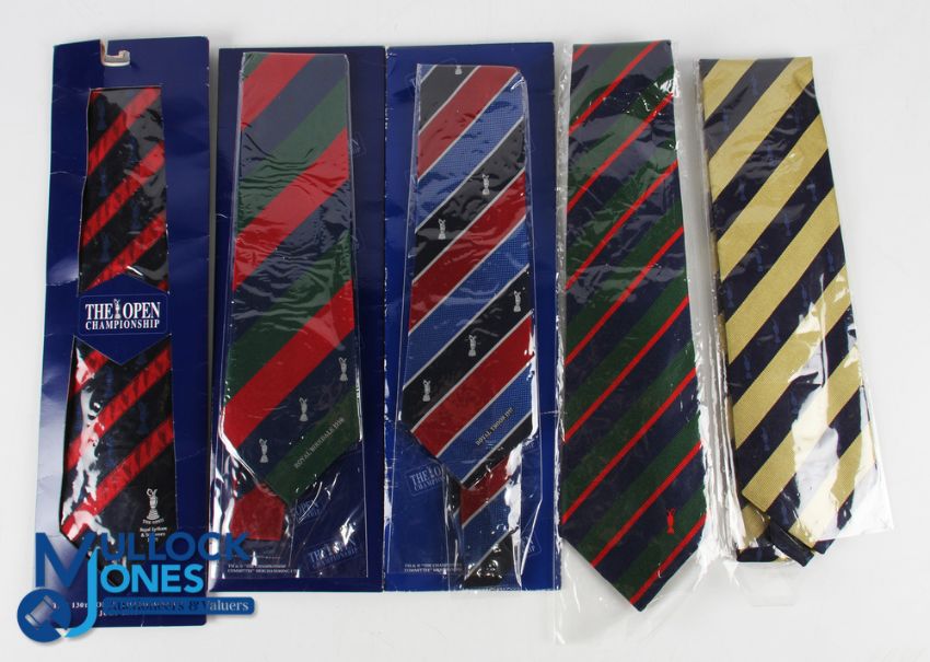 Collection Official Open Golf Championship Merchandise Neck Ties (5) 1997 Royal Troon Open in official merchandise packaging; 1998 Royal Birkdale Open in official merchandise packaging; 2001 Royal Lytham & St Annes Open in official merchandise packaging; plus 2004 Royal Troon and 2005 St Andrews Open ties in original cellophane sleeves - all unused. Note: From The Estate of The Late David Easby