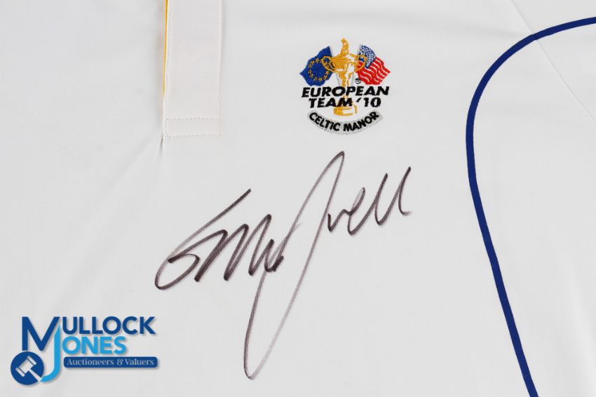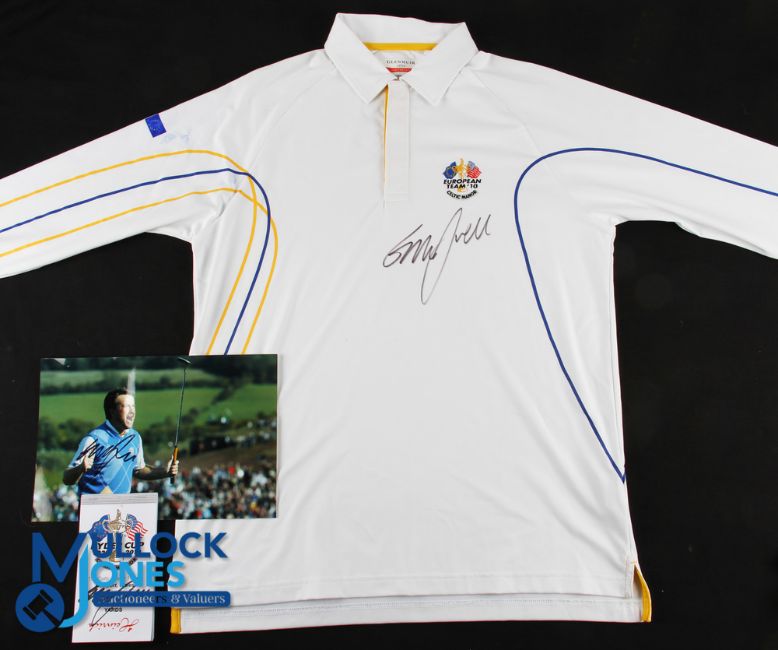 Graeme McDowell 2010 Ryder Cup Celtic Manor Official European Team Signed Shirt, Official Course Guide and Photograph (3) - players shirt signed just below the embroidered European Team logo; Ryder Cup Course Guide signed to the front cover; and signed press photograph after McDowell sunk the final putt to regain the Ryder Cup for Europe.