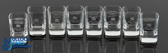 Collection of James Braid Golfing Society Glass Noggins (8) each engraved with Gaelic saying Slainte Mhath! (Good Health) and dates the Society met at Walton Heath Golf Club to play their annual match against usually at the end of May each year to incl 2000, 2x '01, '02, '03 Centenary, '04 with Bill Wood v Peter Thomson?), '06 and one undated (possibly '05?) Note: From The Estate of The Late David Easby