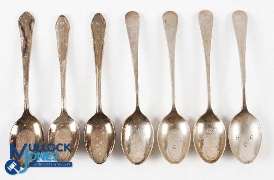 Collection of Walton Heath Golf Club Silver-, and Silver-Plated Teaspoons - to incl 4x matching silver teaspoons each engraved to the bowls with the letters WHGC - silver hallmarked Birmingham c1960s; and 3x matching silver plated teaspoons with engraved finials with the letters WHGC Note: From The Estate of The Late David Easby