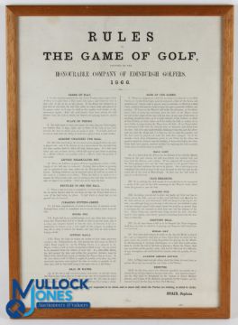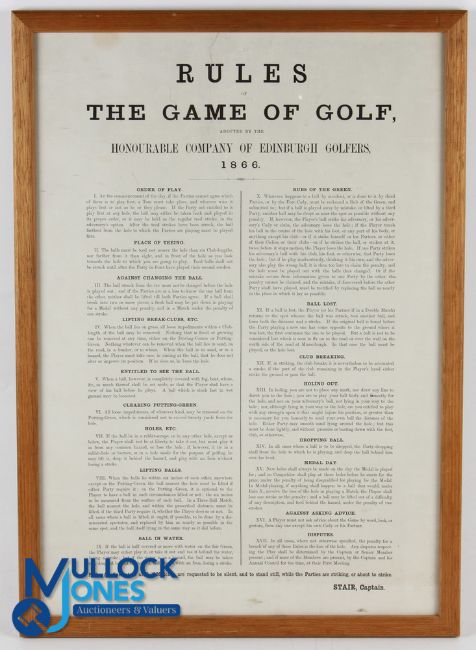 The Honourable Company of Edinburgh Golfers - Rules of The Game of Golf adopted by the club in 1866 comprising 17 rules by order of the Captain Stair - framed and glazed minor tear and creases mid-way along the top edge - overall 21.5" x 15.25" Note: From The Estate of The Late David Easby