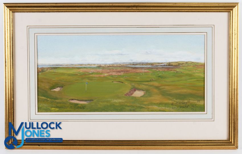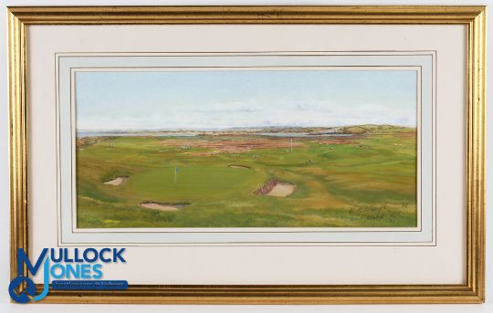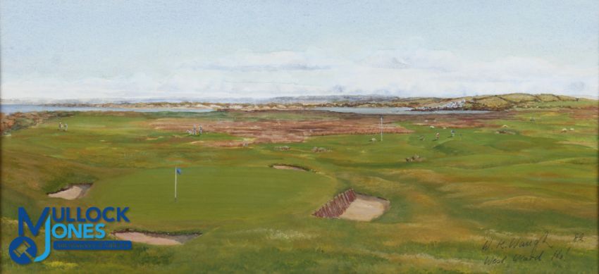 Bill Waugh - Westward Ho! Golf Links original watercolour signed and dated '82 comprising a view across the golf course c/w players and Northam in the distance - image 7.5" x 16" - overall 14" x 22.5" Note: From The Estate of The Late David Easby