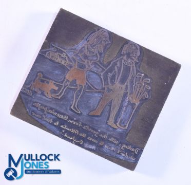 Interesting Artist's Golfing Printers Block Plate - featuring a golfing couple with dialogue "Darling, with the grants from these nice people - we don't need to cross the Atlantic to find our new England - c/w artists initials A M J - overall 5" x 6" Note: From The Estate of The Late David Easby