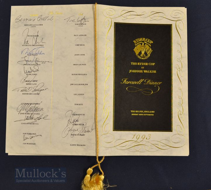 1993 Ryder Cup The Belfry Farewell Signed Dinner Menu - following US winning their second consecutive Ryder Cup 15-13 - signed by Tom Watson (Capt.), Payne Stewart and Davis Love III who secured the victory defeating Constantino Rocca at the last hole; plus 10x members of the European team Bernard Gallacher (Capt), Nick Faldo, Bernhard Langer, Colin Montgomery, Jose Maria Olazabal, Sam Torrance Barry Lane, Joakin Haeggman, Mark James et al
