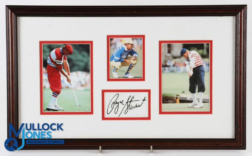 Payne Stewart 2x US Open Golf Champion signed display - comprising 3x colour images wearing his customary signature plus fours together with a large signed white card - mf&g overall 9.75" x 15.75"